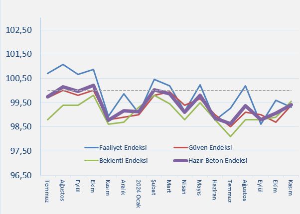 Geçtiğimiz kasım ayında, tüm endeksler bir önceki yılın aynı dönemine göre artış gösterdi. Özellikle Beklenti Endeksi, kaydettiği yükselişle ön plandayken, Faaliyet Endeksi en düşük artış oranıyla dikkat çekti. Güven Endeksi ise ılımlı bir artış sergileyerek birleşik Beton Endeksi’nin yukarı yönlü hareketini destekledi.
