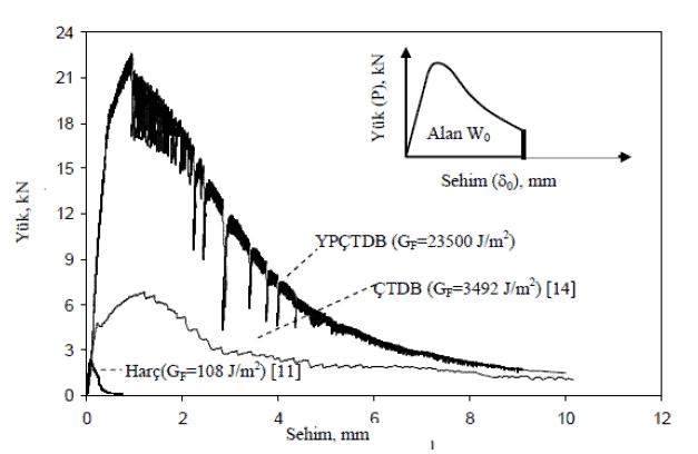 UltraYüksek Performanslı Beton’ların en önemli özelliğinin yüksek enerji yutma kapasitesi olduğu görülür. Karışıma eklenen çelik lifler sayesinde malzeme çok daha sünek bir davranış sergilemekte ve bunun sonucu olarak ta daha fazla enerji yutarak kırılmaktadır. Şekilde UYPB, ÇTDB ve Normal harcın kırılması karşılaştırmalı olarak verilmektedir. Şekilden de görüleceği üzerine UYPB normal harca göre daha uzun sürede ve çok daha büyük şekil değiştirme yaparak kırılmakta, böylelikle normal harca göre çok daha fazla enerji yutmaktadır.