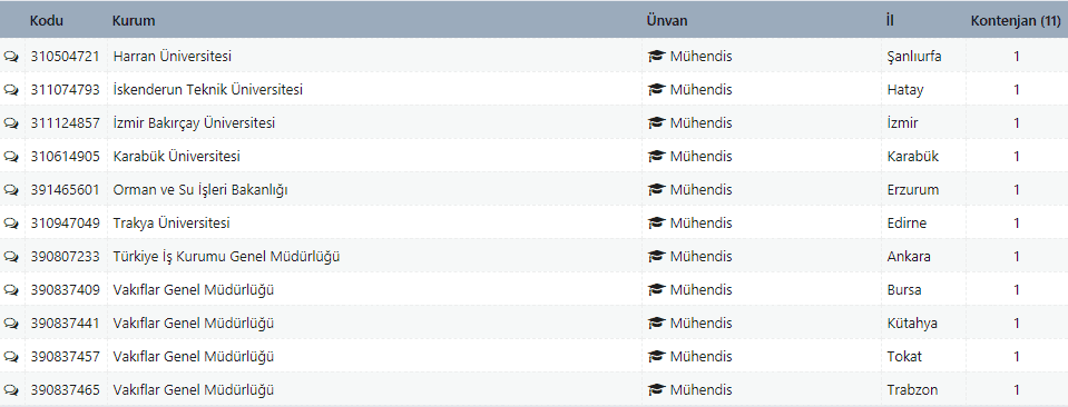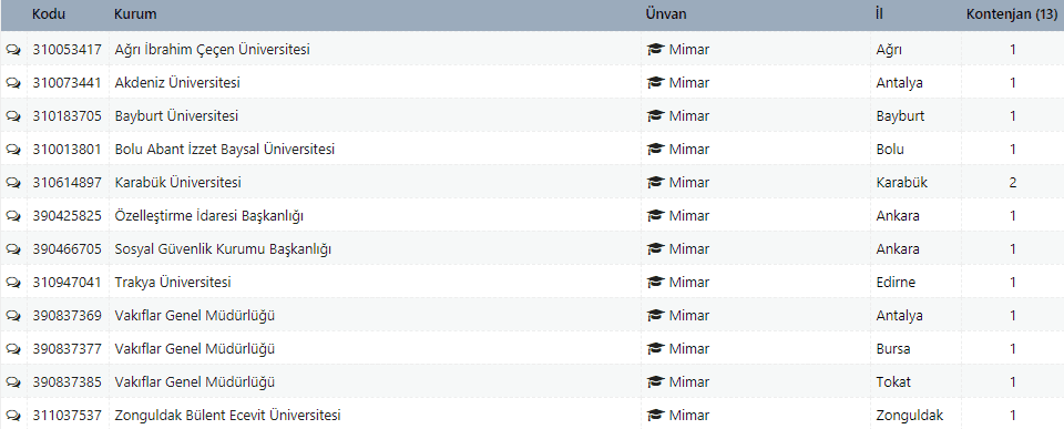 2018/1 alımlarında 942 kadro için toplam 1,471 kontenjan açıldı. Memurlar.net tercih robotuna göre bu 2018’in ilk atama döneminde KPSS ile toplamda 11 İnşaat Mühendisi kadrosu, 13 Mimarlık kadrosu mevcut.