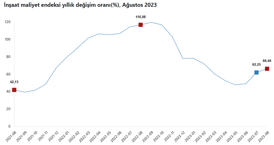 İnşaat Maliyet Endeksinde 2023 yılı Ağustos ayında bir önceki aya göre %4,62 oranında bir artış görünüyor. Bir önceki yılın aynı ayına göre ise artış oranı %66,46. Ayrıca bir önceki aya göre malzeme endeksi %5,82; işçilik endeksi ise %1,92 oranında arttı. Yıllık bazda bakıldığında ise bir önceki yılın aynı ayına göre malzeme endeksi %52,18; işçilik endeksi ise %113,27 oranında arttı.
