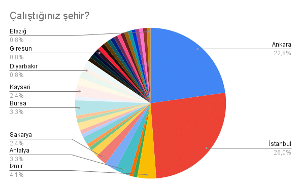 Katılımcıların çalıştığı şehir ilk sırada %26 ile İstanbul, %22 ile Ankara ikinci, %4 ile İzmir üçüncü olmuştur. Diğer şehirlerde çalışan oranları grafikte gösterilmiştir.