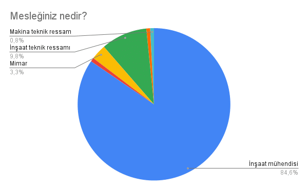 Katılımcılar mesleğiniz nedir sorusuna %85,2 ile inşaat mühendisi, %9,8 ile inşaat teknik ressamı olarak cevap vermiştir.