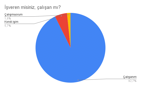 Katılımcıların %92,7’si bir şirkette çalışan konumunda olduğunu belirtirken, işverenlerin oranı %5,7 olarak gözükmektedir. Çalışmayanların oranı ise %1,6. İleride detaylı olarak verilecek maaş aralığı grafiklerinde sadece çalışan olarak belirten kesimin verileri dikkate alınmıştır.