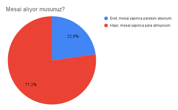 Çalıştıkları firmalarda mesai yapmaları durumunda mesai ücreti alanların oranı %22,8 olarak belirlendi. Piyasada bulunan beyaz yaka mesai almaz algısı hâkim olsa da bağlı olduğumuz iş kanuna göre böyle bir ayrım bulunmuyor. Fazla çalışmaların tümünün ücreti ödenmesi gerekiyor.