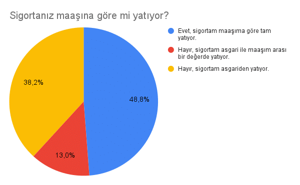 Sosyal Güvenlik Kurumu Primi (SGK) miktarının aldıkları ücret bedeline kıyasında, katılımcıların %48,8’i bu primin hesabının aldıkları ücret üzerinden yapıldığı belirtirken, %51,2’si ise aldıkları ücretten daha az bir bedel üzerinden hesaplandığını belirtti. Bağlı olduğumuz iş kanuna göre sigorta primlerinin çalışanların aldıkları ücret üzerinden hesaplanması işverenin sorumluluğundadır.