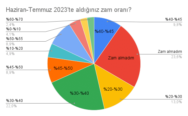 Haziran 2023’te %38,21 olarak açıklanan TÜFE değeri sonrası katılımcılara aynı dönem için aldıkları zam oranları sorulmuştur. Geçen dönem için zam almadığını belirten katılımcıların oranı %23,6 olarak belirlenmiştir. Yine geçen dönem için %30-%40 aralığında zam aldığını belirtenlerin oranı %22, zam oranı %20-%30 aralığında olduğunu belirtenlerin oranı %13 olmuştur. Diğer alınan zam oranları grafikte verilmiştir.