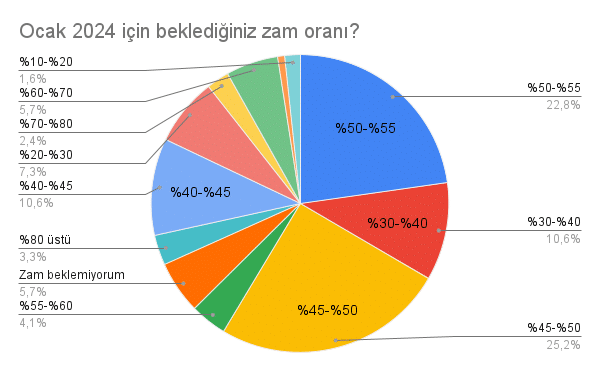 Bulunduğumuz Ocak 2024 için beklenen zam oranı sorusuna ise katılımcıların %25,2’si %45-%50 aralığında olduğu şeklinde cevap vermiştir. Anket asgari ücrete zam oranı ve yıllık TÜFE değişimi (%64,77) açıklandıktan sonra paylaşılmaya başlanmıştır. Diğer beklenen zam oranları grafikte verilmiştir.