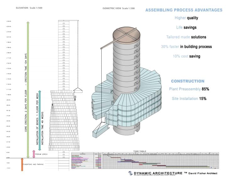 Yapıyı ilklere taşıyan diğer bir özellik ise Hazır Yapım Teknolojisinden yararlanılması. Proje kapsamında betonarme bir çekirdek etrafında çeşitli raylar kullanılarak, fabrikada tesisat ve elektrik sistemleri donatılmış yani tamamen bitmiş şekilde üretilen katlar yerine yerleştiriliyor.