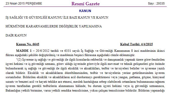 4708 Sayılı Yapı Denetimi Hakkında Kanun’un yapı denetim kuruluşlarının görevlerini düzenleyen 2 nci maddesinin dördüncü fıkrasının (f) bendi ve idari müeyyidileri düzenleyen 8 nci maddesi ile başlığı 4/4/2015 tarih ve 6645 sayılı İş Sağlığı ve Güvenliği Kanunu ile Bazı Kanun ve Kanun Hükmünde Kararnamelerde Değişiklik Yapılmasına Dair Kanun ile değiştirilmiştir.