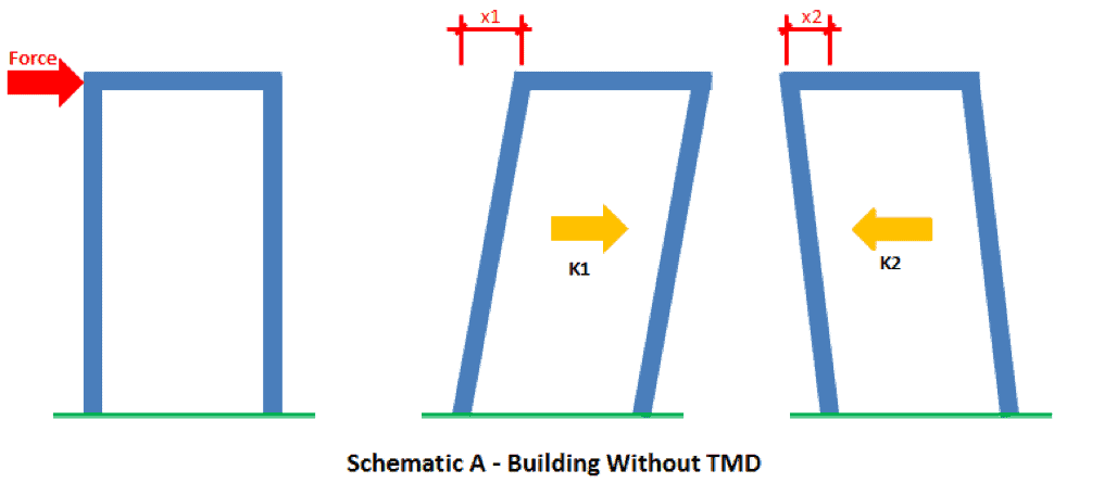 Öncelikle bir binanın kuvvet etkisinde davranışını hatırlayalım. TMD sistemi bulunmayan bir yapıya yanal bir kuvvet etki ettiğinde (deprem, rüzgar vb.) kuvvet yönünde hareket gösterecektir. Bu hareket belli bir ivme yaratacak ve kinetik enerji oluşacaktır(1). Daha sonra sistem geri dönmek isterken tersi tarafta ivmelenecektir (2). Bu denklemde eğim olarak (1)>(2) olduğundan yapı bir süre sonra 0 ivmeye ulaşacaktır. Binanın sağa sola hareketi bitip eski haline (0 ivme) dönmesiyle bir periyot tamamlanır. Binanın periyodu ne kadar uzun sürerse bina içindeki insanlara verdiği rahatsızlık haliyle artacaktır. Hele ki gökdelen gibi yapılarda rüzgar kuvvetleri 1 m deplasmanlara bile sebep olabilmekte iken bu rahatsızlık korkuya dönüşebilir. Alttaki şekil(a)‘da TMD olmayan bir binanın kuvvet alındaki hareketini görebilirsiniz.