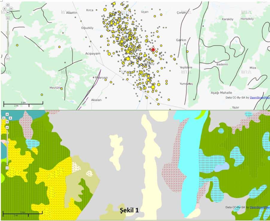 Şekil 1’de altta gösterilen Jeolojik formasyon haritası, jeologlardan aldığımız bilgiler ve bölgede yapmış olduğumuz incelemelerden elde ettiğimiz sonuçlar, Ucarı, Oğuzköy, Apa ve Karahüyük bölgelerinin üzerinde bulunduğu yumuşak alüvyon tabakaların kalınlığının, Yeniköy ve Yeşildere’ye göre çok daha fazla olduğunu gösteriyor. Bu durum depremin merkezine daha yakın olan, fakat göreceli olarak daha sağlam zemin yapısına sahip olan Yeniköy ve Yeşildere köylerinde neden daha az hasar oluştuğunu, Acıpayam ovasının göbeğinde yer alan Oğuzköy, Ucarı ve Kırca’da ise neden daha fazla hasar oluştuğunu açıklayabilecek bir husus olarak görünüyor.