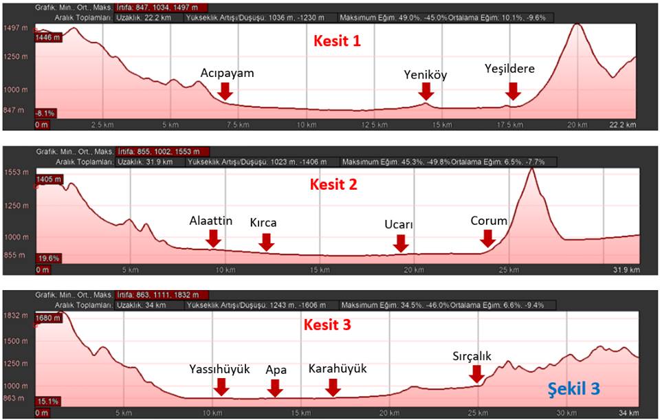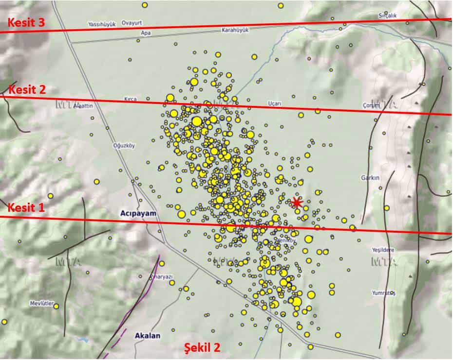 Depremin etkilediği bölgeye biraz daha yakından bakabilmek için Şekil 2’de gösterilen akslardan kesitler almaya (Kesit 1, 2 ve 3) ve böylece bölgeyi topografik açıdan değerlendirmeye çalıştık. Kesit 1 ile Acıpayam’ı ve depremin merkezinin bulunduğu Yeniköy’ü, Kesit 2 ve 3 ile ise önemli oranda hasar oluşan ve Acıpayam ovasında yer alan diğer yerleşim birimlerini görebilmeyi hedefledik. Söz konusu kesitlerden elde edilen görüntüleri Şekil 3 üzerinde görebilirsiniz. Şekil 2 ve 3’ten anlaşılacağı üzere hem ana şok, hem de artçı şoklar ovanın içinde meydana geliyor. AFAD’ın yayınladığı raporda ise Acıpayam depreminin Fethiye-Burdur fay zonunun Acıpayam parçasında oluştuğu ifade ediliyor. Bununla birlikte gerek “Türkiye Deprem Tehlike Haritaları” ve gerekse de MTA tarafından hazırlanan haritalarda ovanın içinde yer alan herhangi bir fay kırığına ait bilgi bulunmuyor. Bölgeye en yakın bulunan faylar ise Şekil 1’de gösterilen Çorum- Garkın ve Yeşildere-Yumurdaş fayları. Ama Şekil 1’den de görüldüğü gibi 20 Mart’tan bu yana meydana gelen depremler bu fay hattının üzerinde oluşmuyor. Anlaşılan o ki Acıpayam depreminden sonra bölgenin aktif fay yapısı hakkında yeni şeyler söylemeye başlayacağız ve bölgeye ilişkin bilgilerimizi güncellemek zorunda kalacağız.