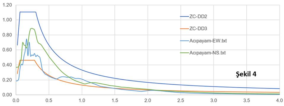 Acıpayam depreminde ortaya çıkan ivme spektrumlarının yeni deprem yönetmeliğine göre nasıl değerlendirilebileceği, bu spektrumların hangi deprem düzeyine (DD) karşılık geldiği, bize iletilen diğer sorular arasında. Aşağıda (Şekil 4) Acıpayam depremi ivme kaydı kullanılarak oluşturulan ivme mukabele spektrumları (Kuzey-Güney (N-S) ve Doğu-Batı (E-W)) ile ana şokun meydana geldiği Yeniköy için Türkiye deprem tehlike haritalarında verilen bilgiler kullanılarak çizdirilen spektrumları görebilirsiniz. Yeniköy spektrumlarını çizdirirken yerel zemin sınıfının ZC olduğunu kabul ettik. Spektrum eğrilerine bakarak Acıpayam depreminin, 50 yılda aşılma olasılığı %10 olan ve yönetmeliğimizde DD-2 ile ifade edilen tasarım depreminden daha küçük elastik ivme talepleri oluşturduğunu belirtmeliyiz. Başka bir ifade ile bu depremin yönetmeliğimizde yer alan tasarım depreminden daha küçük bir deprem olduğunu söyleyebiliriz. Bununla birlikte hesapladığımız değerler Acıpayam depreminin, sınırlı hasar performans seviyesinin (SH) kontrol edildiği DD-3 depreminden daha büyük bir deprem olduğunu gösteriyor. Mukabele spektrumlarından da anlaşılacağı gibi Acıpayam depremi ortaya çıkardığı ivme talepleri açısından değerlendirildiğinde küçük bir deprem değildir. Geçmişte meydana gelen hareketler bölgenin 7.0 büyüklüğünde depremler üretme potansiyelinin olduğunu göstermektedir. Aynı fay zonunun kuzeyinde Burdur’da meydana gelen depremler (3 Ekim 1914 (Ms 7.0) ve 12 Mayıs 1971 (Ms 5.9)) ile güneyinde Fethiye’de (24/25 Nisan 1957 (Ms 6.8, 7.1)) meydana gelen depremler bu gerçeğin ispatıdır.