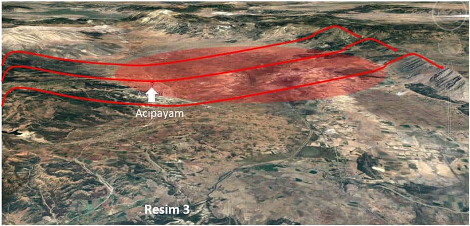 Çevre ve Şehircilik il Müdürlüğü, Büyükşehir Belediyesi ve AFAD eliyle yürütülen hizmetlerin depremden etkilenen vatandaşlara ulaştırılmasında başlangıçta zaman zaman sıkıntılar yaşandı. Bunun en büyük sebeplerinden biri depremin geniş ve dağınık yapılaşmayı içeren bir alanı etkilemiş olması. Yeniköy, depremin merkezi olarak ilan edilse de Yassıhüyük, Apa, Karahüyük, Ucarı, Yeşilyurt, Oğuzköy, Alaattin, Kırca ve Acıpayam’ın içi de dahil olmak üzere pek çok yerleşim biriminde hasar meydana geldiğini belirtelim (Şekil 2). Hatta şu ana kadar ulaşılan bilgiler Oğuzköy, Ucarı, Kırca ve Karahüyük’te tespit edilen hasar oranlarının, depremin merkezi olan Yeniköy’den çok daha fazla olduğunu gösteriyor. Bu durum Acıpayam depremi açısından üzerinde konuşulması gereken bir husus. Resim 3’te gösterilen hava fotoğrafı depremin etkilediği Acıpayam ovasının çanak şeklindeki yapısını ve depremin meydana geldiği alanın sağında ve solundaki dağlık bölgeleri net bir şekilde gösteriyor.