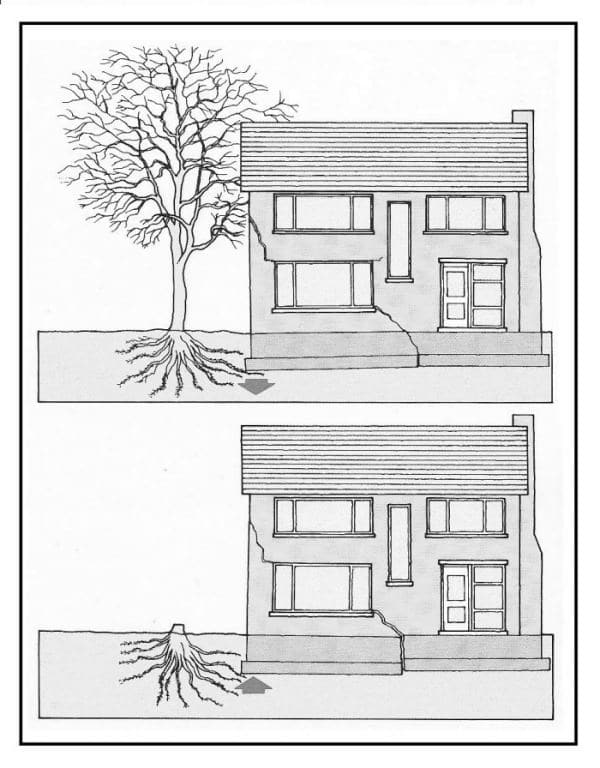 Bazı bilimsel verilere göre : Yetişkin ağacın kesilmesi veya kaldırılması halinde killi toprak kazandığı suyu alacak kökler olmadığında su ile doygun hale gelir ve adeta “şişer”. Bu durumda “oturmanın “ tersi olay olur ve temel yükselir. Yani, yakındaki gelişkin bir ağacın kaldırılması da zarar verebilir. Sonuçta, evin yapısında genelde gözle fark edilemeyen, ancak pencere pervazlarının çatlayıp yükselmesi ile ortaya çıkan durumlarla karşılaşılır.