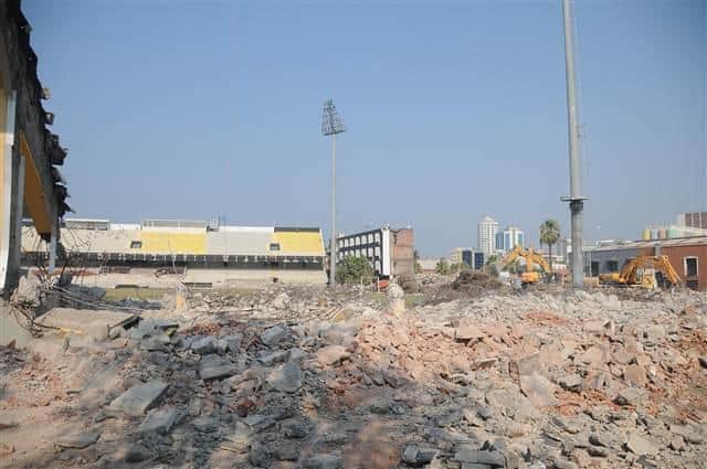 İlk kazmayı 21 Temmuz’da vuran Nerman Hafriyat, açık tribünün bir bölümü ile ön cephedeki idari binanın büyük bölümünü yıkarken, firma sahibi Gökhan Nermanoğlu, “Yer yer kırıcı kullanmaya bile gerek kalmıyor. Kova dediğimiz iş makinası yıkım için yeterli oluyor” dedi.