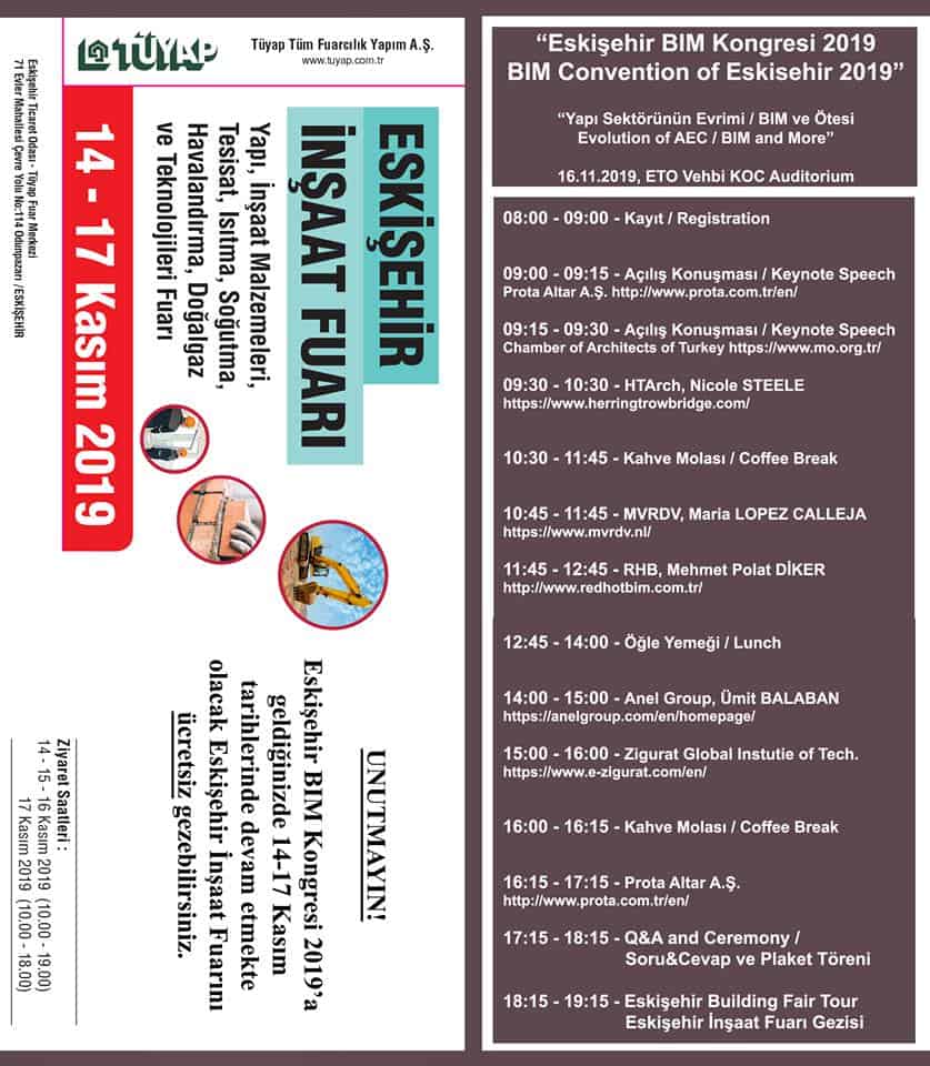 Mimarlar Odası Eskişehir Şubesi olarak Prota Altar A.Ş. ana sponsorluğunda ve diğer paydaşlarımızla organize ettiğimiz “ESKİŞEHİR BIM KONGRESİ 2019” 16 Kasım 2019 Cumartesi günü ETO Fuar ve Kongre Merkezi Oditoryumunda gerçekleşecektir.