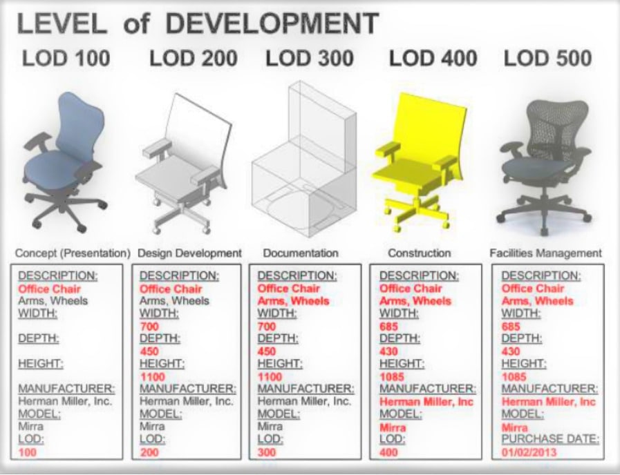 - LOD300: Bir ürünün dokümantasyonu ile birlikte verilir. Bunlara ek olarak zamanlama da içerir ve önceki LOD seviyelerinden daha kesin ve net bilgiler içerir.