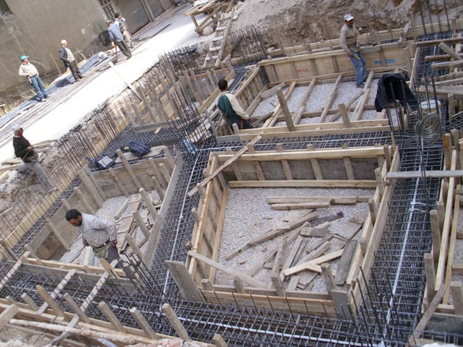 4- Temel altı mıcır ve drenaj işleri: Hafriyatı yapılmış zemin üzerindeki kaba toprak sıyrılarak mıcır ile tesviye yapılır. Mıcır içinde drenaj için özel drenaj boruları döşenir. Drenaj borularının yeraltı sularını tahliye edebilmesi için eğimlerine dikkat edilir. Bu işlemi düzgün yapabilmek için mıcır kalınlığının 18 cm den daha az olmaması gerekir.