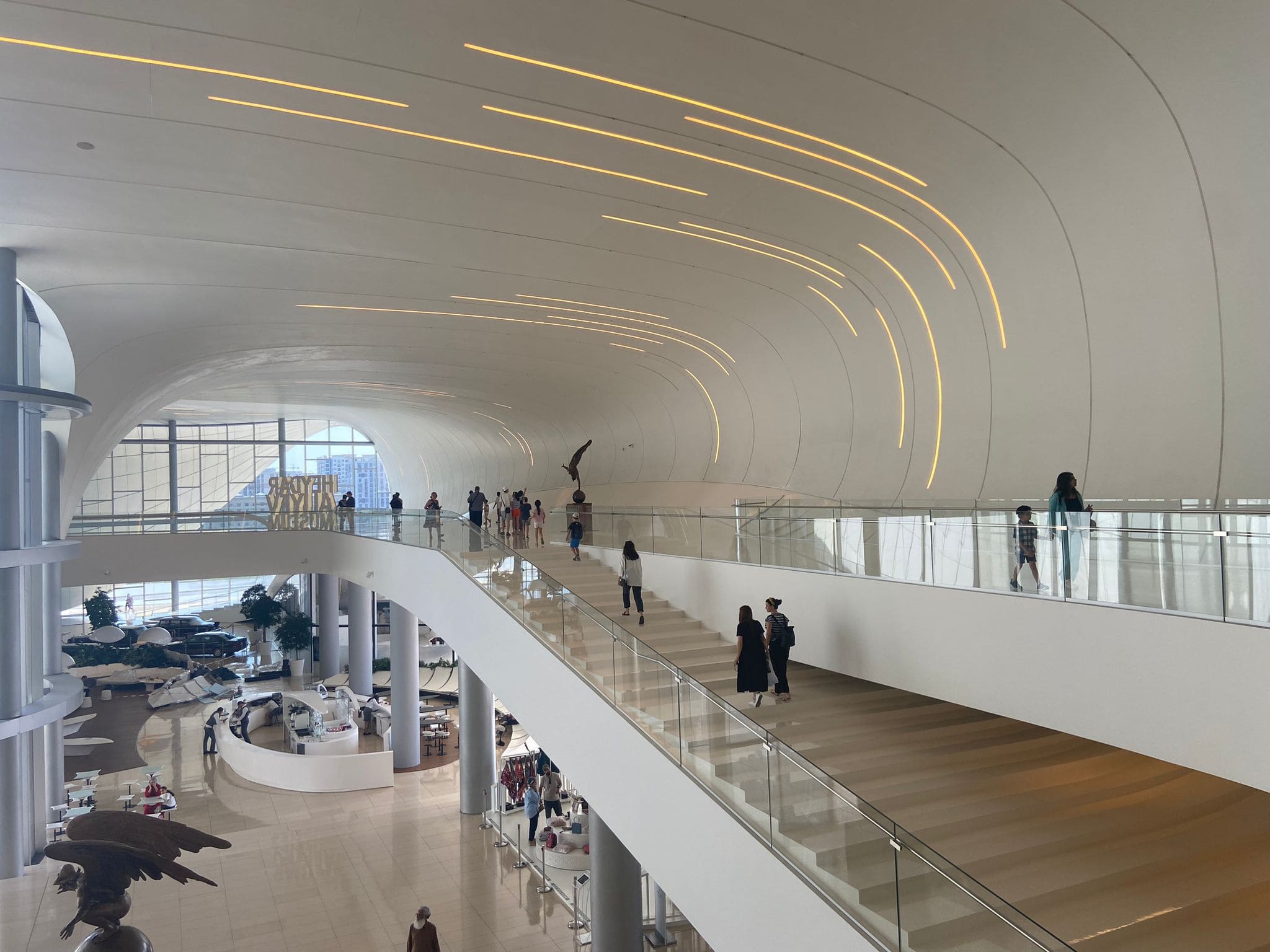 Adını 1969-2003 yılları arasında Azerbaycan’a liderlik yapmış olan Haydar Aliyev’den alan bu eserde, dekonstrüktivizm akımının en önemli temsilcilerinden biri olan Zaha Hadid, sıra dışı ve postmodern bir tasarım ortaya koymuştur. Yapının yüzeyleri ile oynanarak dik açılı kenarlar akışkan bir şekilde çözülmüştür. Mimarisi, Hazar Denizi’nin yükselişini yansıtmaktadır. Bu yapı Azeri toplumunun geleceğe yönelik yaklaşımının bir sembolü olarak da görülmektedir.