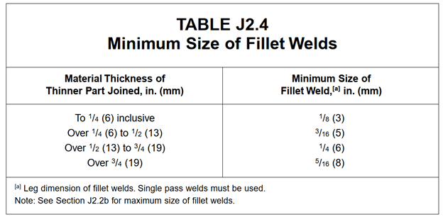 Amerika çelik yapılar yönetmeliğine göre (specification for structural steel building) kaynak kalınlıklarına ait sınırlandırılmalar verilmiştir. Ülkemiz çelik yönetmeliği bu yönetmelikten (2010 versiyon) uyarlama olduğu için benzer değerler bulunmaktadır. Köşe kaynakları için miminum değerler Tablo J2.4’te verilmiştir. Benzer şekilde bu kısıtlar kısmi(PJP) veya tam penetrasyonlu(CJP) küt kaynakların takviyesi amacıyla kullanılan köşe kaynaklar için geçerli değildir.