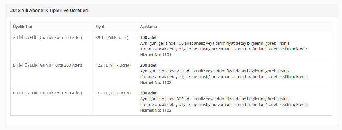 2018 Yılı için Birim fiyatlara erişim ücreti aşağıdaki gibiydi