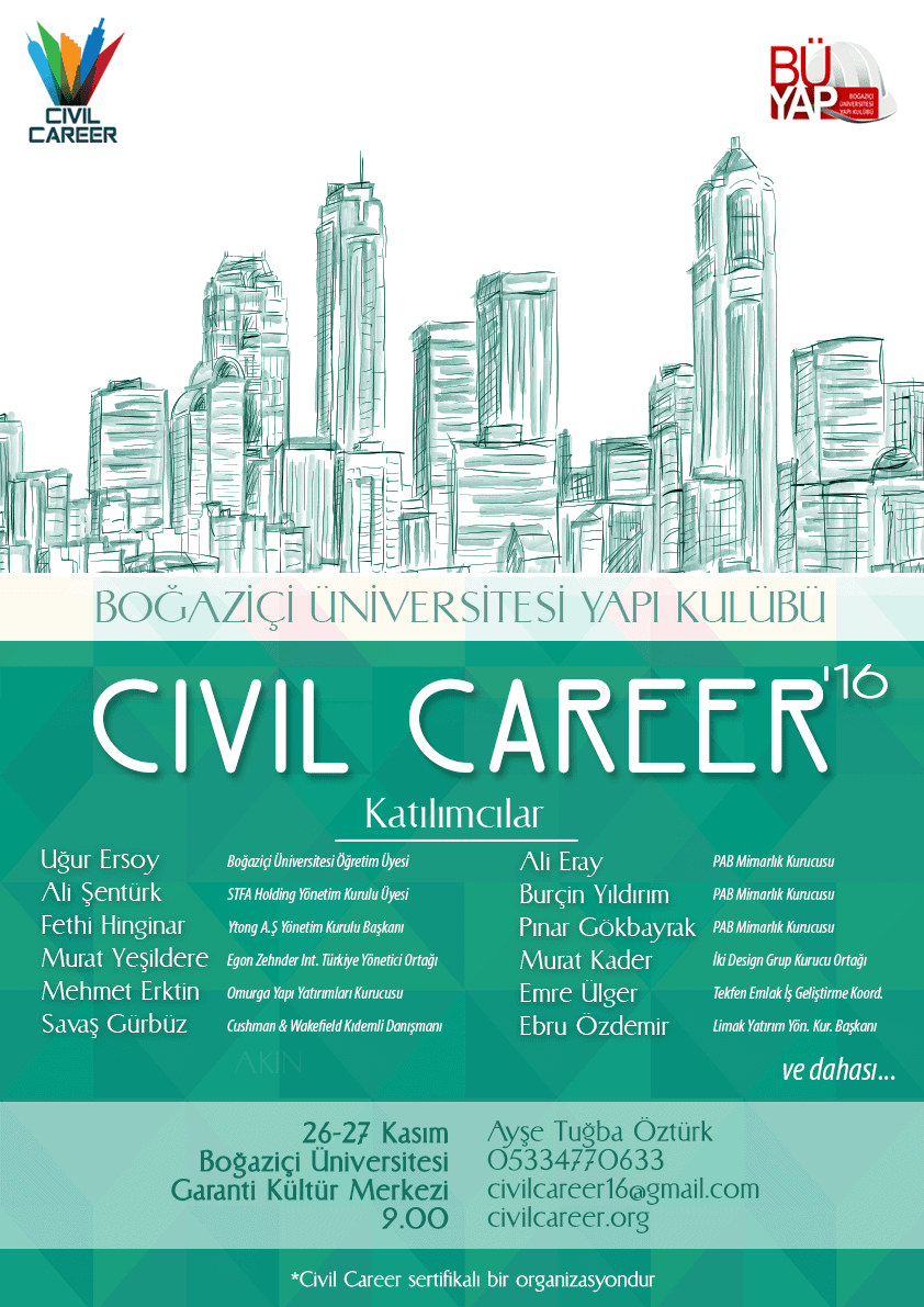 Boğaziçi Üniversitesi Yapı Kulübü organizasyon takvimine 2009 yılında dahil olan Civil Career’ın ilki 21 Kasım 2009 tarihinde gerçekleştirilmiştir. Etkinlik adını, kalıp olarak İngilizcede bulunmayan; fakat inşaat mühendisliğinin İngilizce karşılığı olan “Civil Engineer” ile kariyer günleri anlamına gelen “Career Days” sözcüklerinin birleşiminden almaktadır. Başarıyla gerçekleştirilen ilk etkinliğin ardından hocalarımız ve yönetim kurulumuz ortak bir karara varıp Civil Career’ı BÜYAP’ın geleneği haline getirmiştir. İnşaat sektörünün önde gelen firmalarının yöneticilerini Türkiye çapındaki inşaat mühendisi ve mimar adaylarıyla seminer çatısı altında buluşturan etkinlik, bu özelliğiyle kariyer günleri kategorisine girmektedir. Civil Career’ın başlıca karakteristik özellikleri ise; Sektördeki yenilikler veya giderek önemi artan konular ele alınmaktadır. Böylelikle organizasyon yönlendirici bir rol üstlenmekte, öğrencilerdeki sektöre dair bilinci arttırmaktadır. Konuşmacılar inşaat mühendisliğine dair teknik konulara da değinmektedirler. Böylelikle organizasyon eğitici bir rol üstlenmekte, katılım sonrası verilen sertifikayla da bu eğitimi tescillenmektedir. Civil Career’da konferans aralarında ve program sonunda çeşitli aktiviteler düzenlenmektedir. Böylelikle organizasyon bütünleyici bir rol üstlenmekte, katılımcıları kaynaştırarak meslektaşlar arasındaki bağları kuvvetlendirmektedir. Boğaziçi Üniversitesi Yapı Kulübü olarak misyonlarımızdan biri de, Civil Career’ın katılımcı sayısını her geçen yıl arttırmak ve uluslararası bir konuma getirmektir.