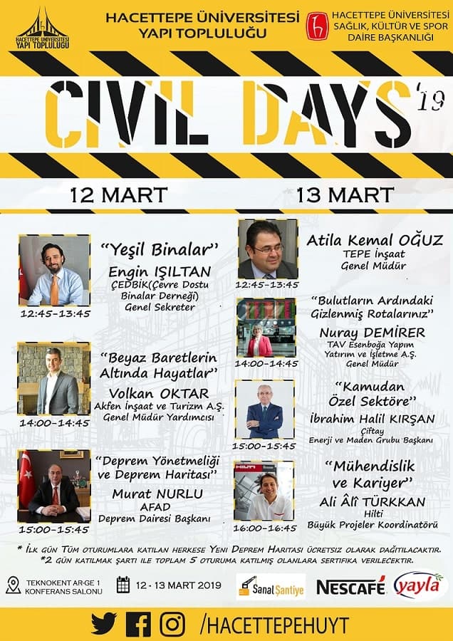 Civil Days, iş hayatlarında her zaman başarıyı hedeflemiş ve her daim hedeflediği başarıya ulaşmış başarılı isimlerin, CV (Curriculum Vitae)’sine değer katmak isteyen öğrencilerle buluşturulduğu bir etkinliktir. Etkinliğimize çağırılan isimlerin; kendilerinin veya şirketlerinin adına şu anki konumlarına nasıl geldikleri ve bu konuma gelirken karşılaştıkları engeller, gülünçlükler ve başarılarla ilgili anılarını, tecrübelerini öğrencilerle paylaştığı bir söyleşi etkinliğidir.