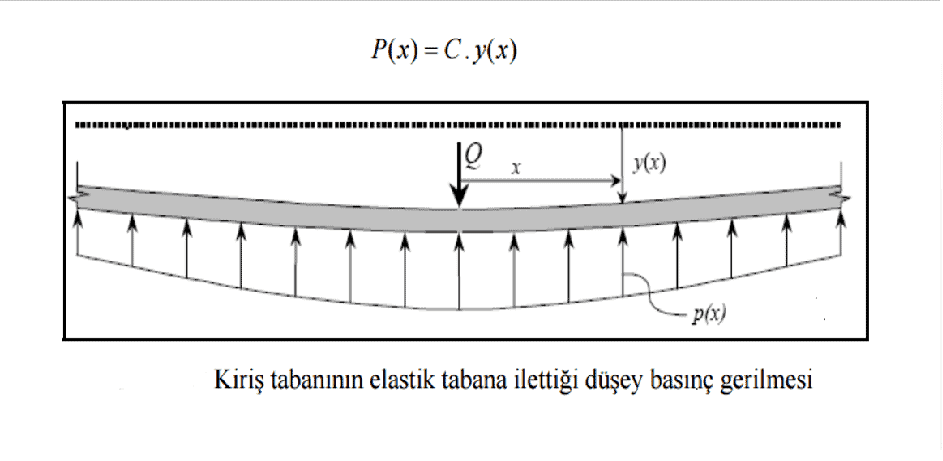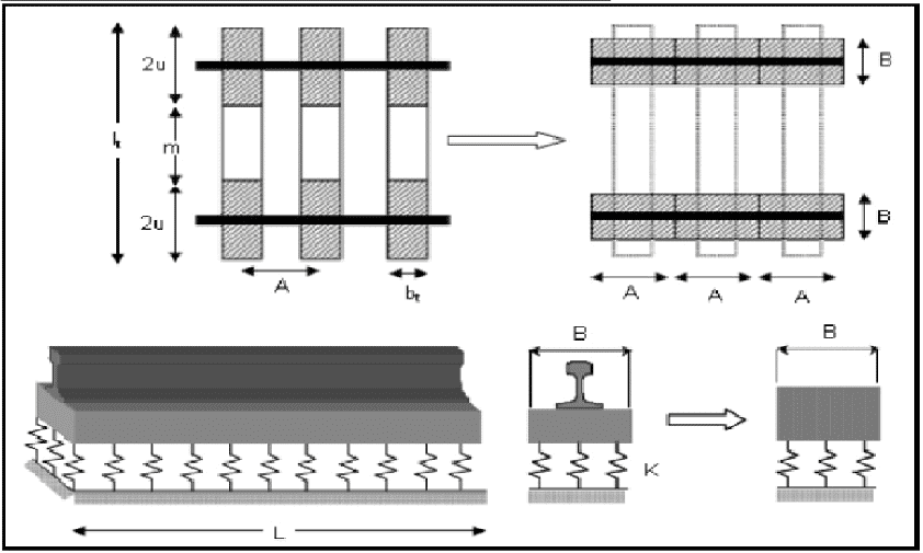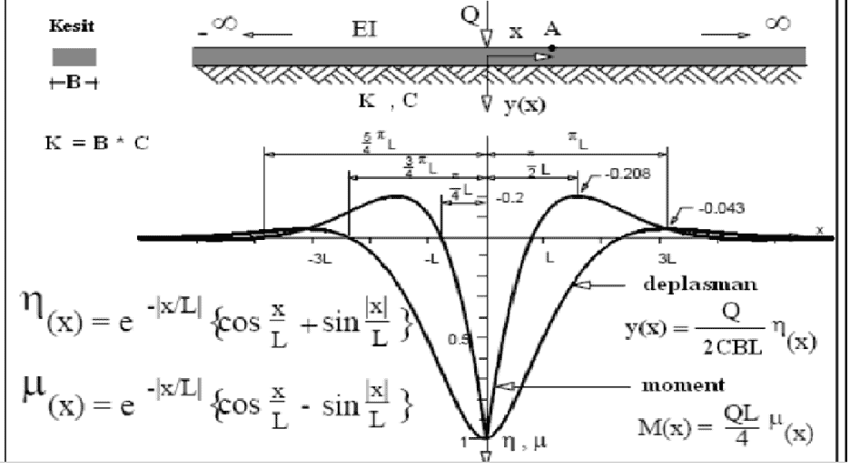 Şekilde ki, “B” sanal kiriş genişliği, “L” karakteristik uzunluk (elastik uzunluk) olarak isimlendirilir. Winkler hipotezine bağlı olarak geliştirilen “Sürekli Kiriş Modeli” için öncelikle sanal kiriş genişliği ve karakteristik uzunluk değerleri elde edilir.