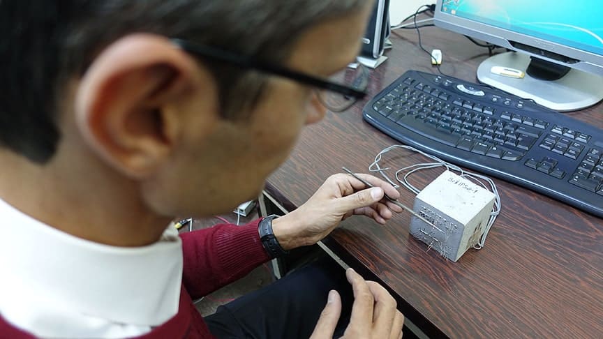 “Onlara basınç, eğilme ve yarma testleri yaptık. Sonuçta en iyi karışımı ortaya çıkardık. Akıllı beton içinde iletken özelliği bulunan bakır ve çinko karışımı olan pirinç alaşımı lifi, çimento, kum ve çakıl karışımı, akışkanlaştırıcı ve su var. Klasik betondan farkı pirinç lifinin bulunması. Beton kalıbının içine önce bakır elektrotlar koyuyoruz. Bu elektrotlar betonun elektriksel direncini kablolar yoluyla veri toplama sistemine iletmemizi sağlıyor. Elde ettiğimiz veriler yapının sağlığına ilişkin bilgiler veriyor. Veriler kabloyla aktarılabileceği gibi kablosuz olarak da ulaştırılabilecek. Bir yazılımla sonuçlar anlık cep telefonuna gelmesi de mümkün olacak.”