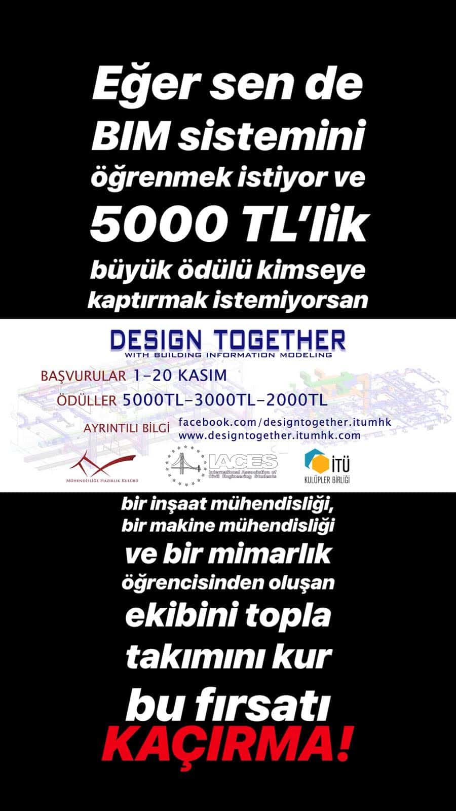 İstanbul Teknik Üniversitesi Mühendisliğe Hazırlık Kulübü’nün düzenlediği, BIM (Building Information Modeling-Yapı Bilgi Modellemesi) sisteminin kullanıldığı uluslararası Design Together Yarışması yaklaşıyor! Eğer sen de BIM sistemini öğrenmek istiyor ve 5000 TL’lik büyük ödülü kimseye kaptırmak istemiyorsan bir inşaat mühendisliği, bir makine mühendisliği ve bir mimarlık öğrencisinden oluşan ekibini topla, takımını kur ve bu fırsatı kaçırma! Katılım şartları, başvuru tarihleri ve diğer detayları öğrenmek için aşağıdaki linklere tıkla!