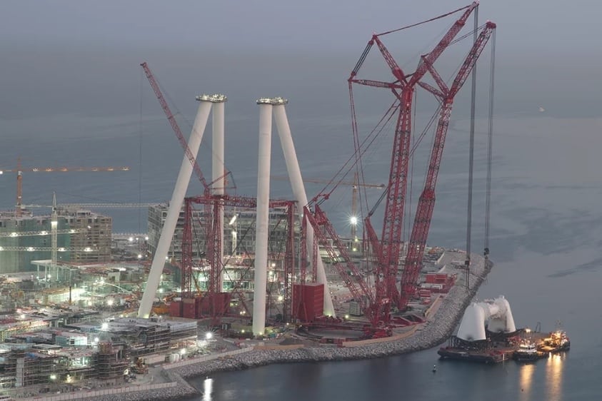 Bacaklar ve iş mili Abu Dabi’nin dışında inşa edildi ve 2016’da getirilerek doğrudan temellerin üzerine yerleştirildi. Her bacak 890 ton, 126 metre uzunluğunda ve 6.5 metre genişliğindedir. Bu bacakları kurulumu için iki adet “süper ağır kaldırma” vinci kullanıldı. Biri 5000 tonluk halka vinç ve diğeri 3000 tonluk paletli vinç, bu vinçler 137 metre yükseklikte çalıştılar.