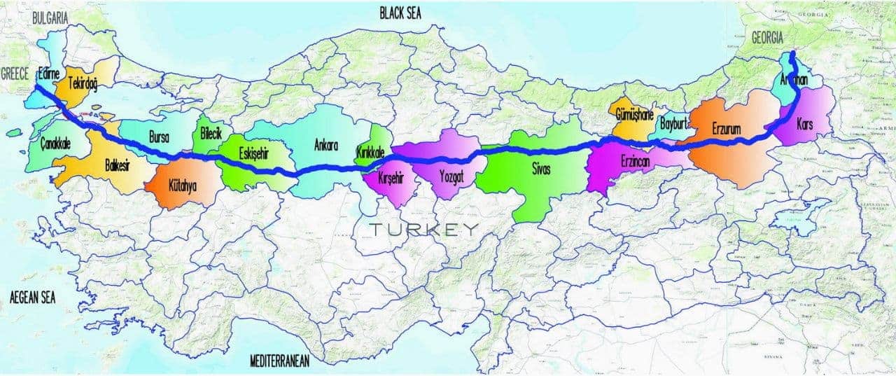 TANAP’ın Türkiye-Gürcistan sınırında Ardahan’ın Posof ilçesi Türkgözü köyünde başlayan yolculuğu, Kars, Erzurum, Erzincan, Bayburt, Gümüşhane, Giresun, Sivas, Yozgat, Kırşehir, Kırıkkale, Ankara, Eskişehir, Bilecik, Kütahya, Bursa, Balıkesir, Çanakkale, Tekirdağ ve Edirne olmak üzere 20 ilden geçiyor. 67 ilçe, 600 köy geçerek, toplam uzunluğu bin 850 kilometreye varan yatırım miktarı yaklaşık 7 milyar dolar olan TANAP, Türkiye-Yunanistan sınırında sona eriyor.