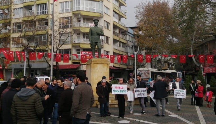 Atatürk Meydanı’nda toplanan bir grup vatandaş, bir inşaat firması tarafından dolandırıldıklarını belirterek, ellerindeki pankartlarla tepki gösterdi. Grup adına konuşan Yusuf Aksoy, dolandırıldıkları inşaat firmasının 2018 yılında yaptığı basın açıklamasında vatandaşların haklarının verileceğini hatırlattı. Aradan geçen zamana karşı haklarını geri alamadıklarını söyleyen Aksoy, “Yıllardır biriktirdiğimiz emeklerimiz ve hayallerimizi elimizden alan inşaat sahipleri A.K ve M.D. hesap vermeli. 2018 yılında yaptıkları açıklamada şirketin tüm projelerini bitireceklerini ve mağdur olanların da haklarının verileceğini söylemişlerdi. Ancak kimsenin mağduriyetini gidermemiş, ne projeleri bitirmiş ne de hak sahiplerine haklarını geri verdi” dedi.