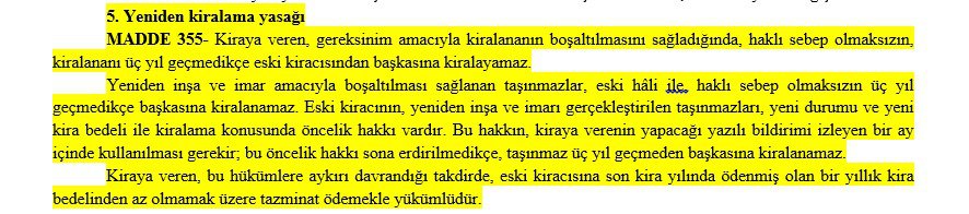 6098 Sayılı Borçlar Kanunu’na eklenen yeni bir maddeyle “Kiraya veren, gereksinim amacıyla kiralananın boşaltılmasını sağladığında, haklı sebep olmaksızın, kiralananı üç yıl geçmedikçe eski kiracısından başkasına kiralayamaz.” denildi.