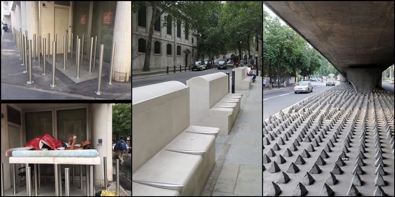 Evsiz insanların uyuma alanı olarak kullandığı pek çok alan onların uyumasını engellemek için çivilerle veya rahatsız edici tasarımlara sahip cisimlerle kaplanıyor.