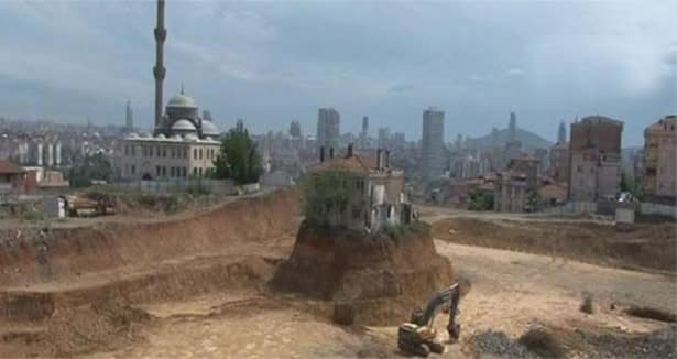 Kadıköy Fikirtepe’de çevresindeki onlarca bina yıkılmasına rağmen, 31 dönümlük arazinin ortasında tek başına kalan 2 katlı ev kentsel dönüşüme karşı tek başına direniyor. Etrafı boşaltıldığı için tepeyi andıran toprak parçası üzerinde kalan ev, ilginç görüntü oluşturdu