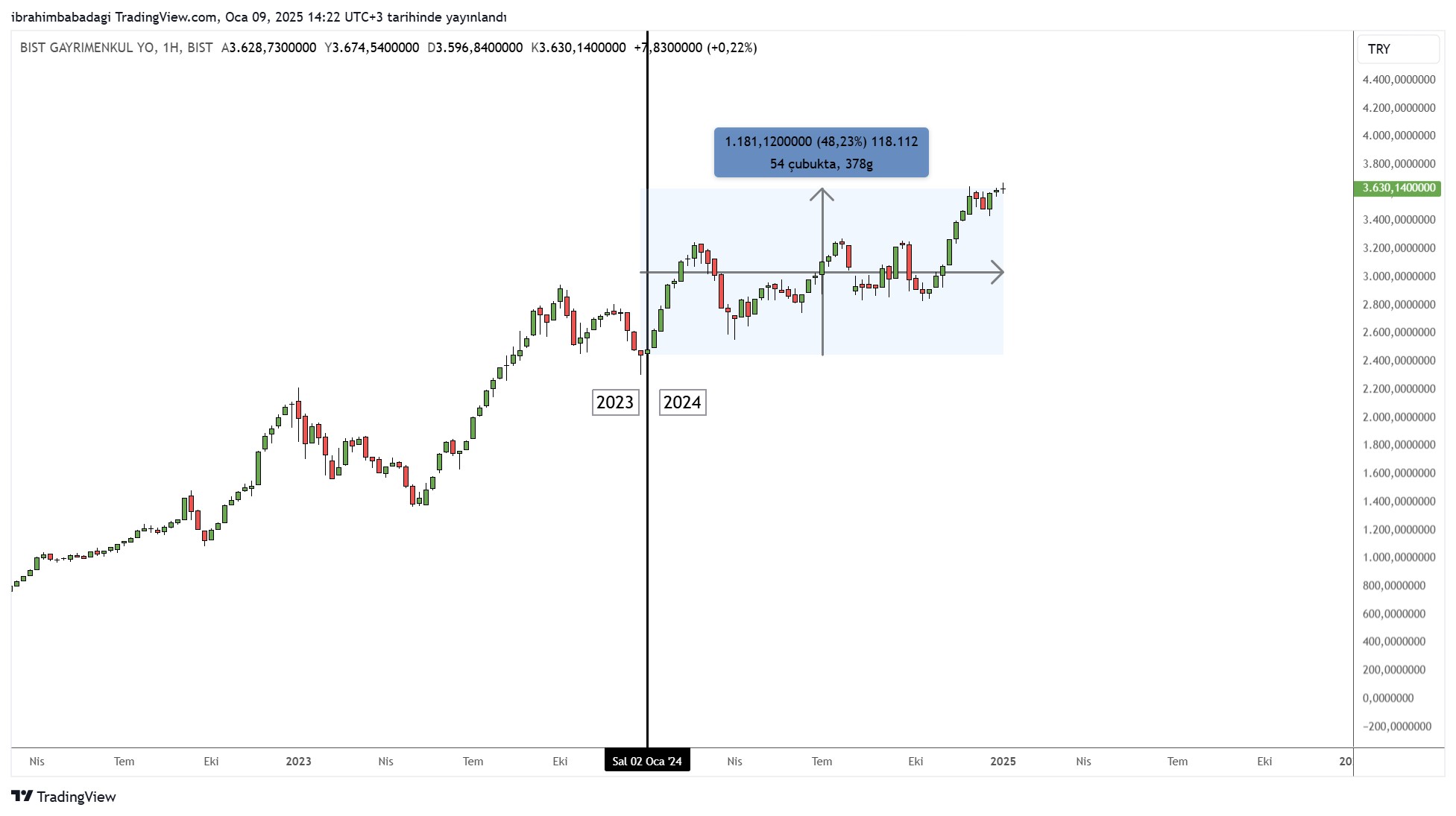 XGMYO’da 2024’ün sonlarına doğru piyasalara düşen ve sıkça konuşulan faizlerin düşürülmesi ve konut kampanyaları endeksi hareketlendirdi. Yükselişin neredeyse yarısından çoğu Ekim ayından itibaren, son çeyrekte gerçeleşti.