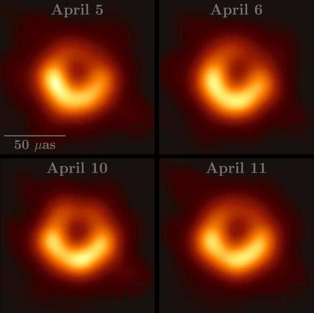 Yukarıda gördüğünüz görüntüler farklı günlerde elde edilmiş. Gördüğünüz gibi bir taraf diğer tarafa göre daha parlak, bilim insanları kara deliğin etrafındakileri ışık hızında kendi etrafında çeviriyor olmasının buna sebep olabileceğini söylüyor. Orta kısım ise ışık dahil her şeyi çektiği için karanlık olarak görünüyor.