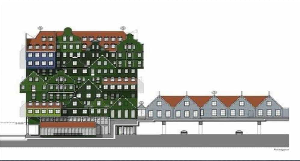 Mimarları Molenaar & Van Winden‘in yorumları: Dinamiksel bir kentsel alanda yer alan otelin cephesi farklı tipte zaanse anıtsal evler birikimini yorumlamaktadır.