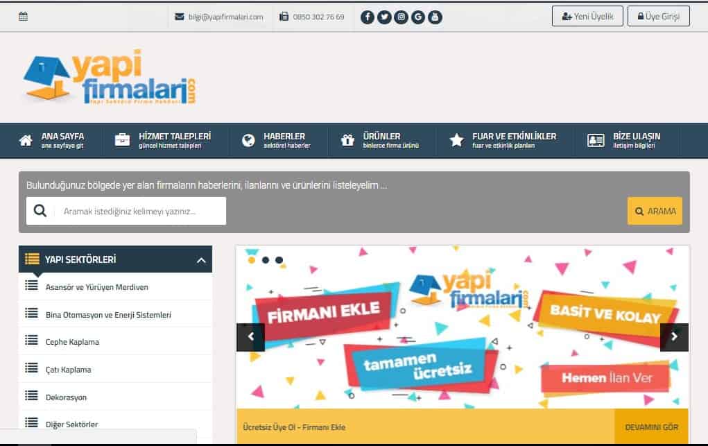 İnşaat sektöründe ~100.000 firmanın ~1000 kategoride listelendiği ve iletişim bilgilerinin yer aldığı bölümdür. Bu bölümde il, ilçe, mahalle ve kategori bazlı firmalar listelenebilmektedir.