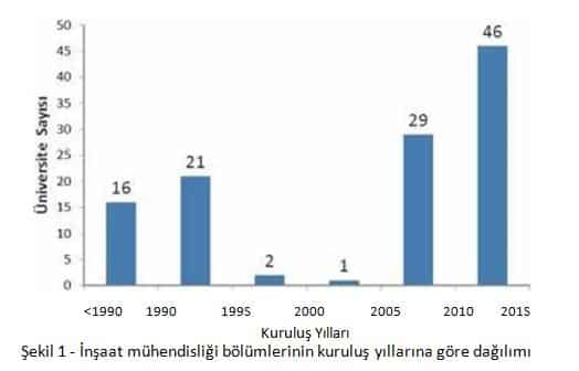 Özellikle son 10 yıllık süreç içinde çok sayıda İnşaat Mühendisliği Bölümünün açılmış olması önemli bir sorun durumundadır. Aşağıda verilen şekiller İnşaat Mühendisleri Odası tarafından hazırlanan “İnşaat Mühendisliği Eğitimi Vizyon Raporu-2016” belgesinden alınmıştır ve son yıllarda ortaya çıkan ve gelişmeden ziyade şişmanlamaya işaret eden durumu net bir şekilde özetlemektedir. Şekil l’de Ülkemizde inşaat mühendisliği bölümlerinin kuruluş yılları verilmektedir. Bu şekilden de anlaşılacağı üzere 2005 yılına kadar açılan bölüm sayısı 40 iken, 2005 yılından sonra 75 bölüm daha açılmış ve toplam inşaat mühendisliği bölümü sayısı 115 olmuştur. Bu bölümlerin 42 tanesinde, yani yaklaşık %37’sinde ise ikinci öğretim programlan bulunmaktadır.