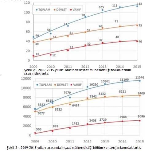 Şekil 2 ve Şekil 3’te ise bölüm ve kontenjan sayılarındaki artışlar gösterilmiştir. Verilen şekillerden de anlaşılacağı gibi özellikle son yıllarda hem açılan bölüm, hem de kontenjan sayılarında ciddi bir artış söz konusudur. Gün geçtikçe artan bu kontenjanlar sebebiyle neredeyse her sene 12 000’e yakın gencimizin mezun olarak inşaat mühendisleri arasındaki yerini alacağını tahmin etmek zor değildir.