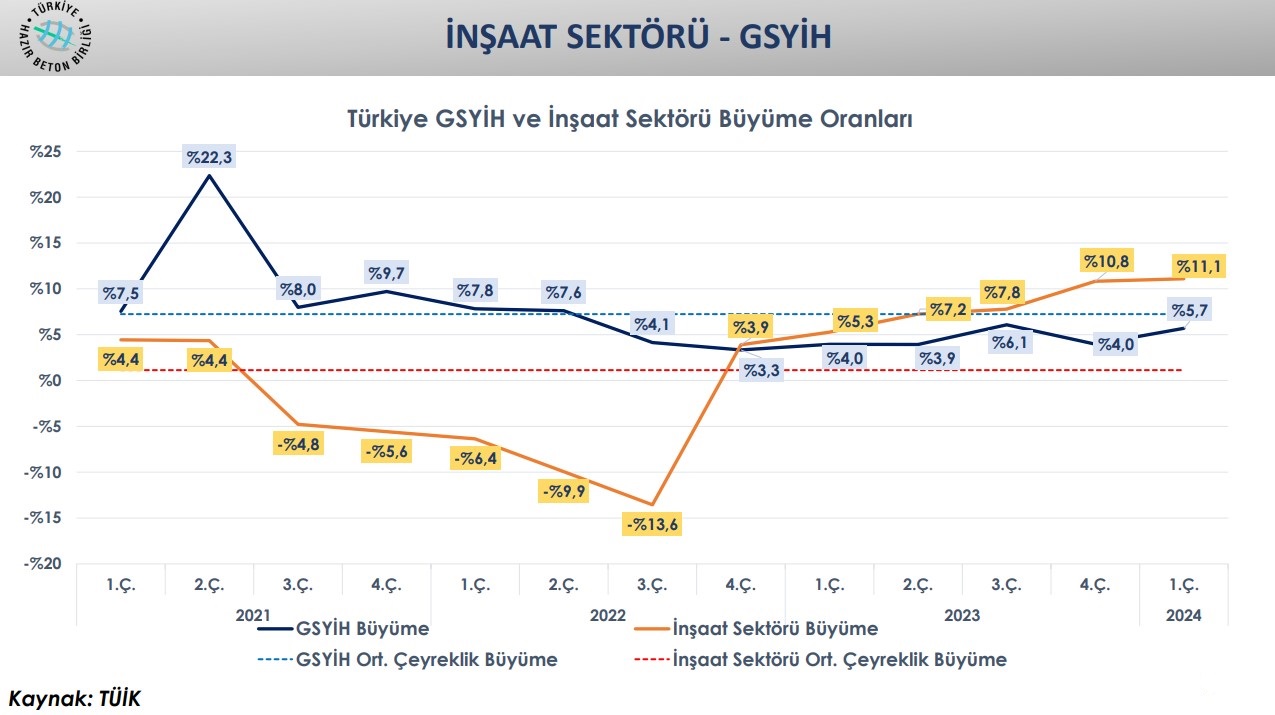2013 yılından 2017 yılına kadar inşaat sektörünün GSYİH içindeki payı ortalama %8 seviyesinde gerçekleşmiş ve çeyreklik dönem bazında en yüksek %9,3 seviyesini görmüştür. 2024 yılı ilk çeyrek verilerine göre sektörün payı %6,2’dir.