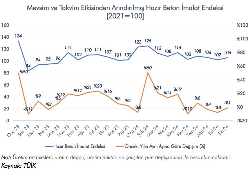 2024 yılının ekim ayında bir önceki yılın aynı ayına göre %1↓ düşüş, bir önceki aya göre %3,5↑ artış göstermiştir. Hazır Beton İmalat Endeksi 2024 ocak-ekim döneminde bir önceki yılın aynı dönemine göre ortalama %6↑ artış göstermiştir.