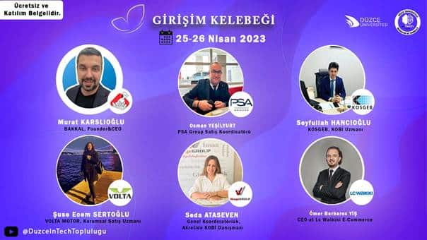 GİRİŞİM KELEBEĞİ 25-26 Nisan 2023 tarihlerinde 14.00-17.00 saatleri aralığında Düzce InTech Topluluğu YouTube hesabında canlı olarak gerçekleştirilecektir.
