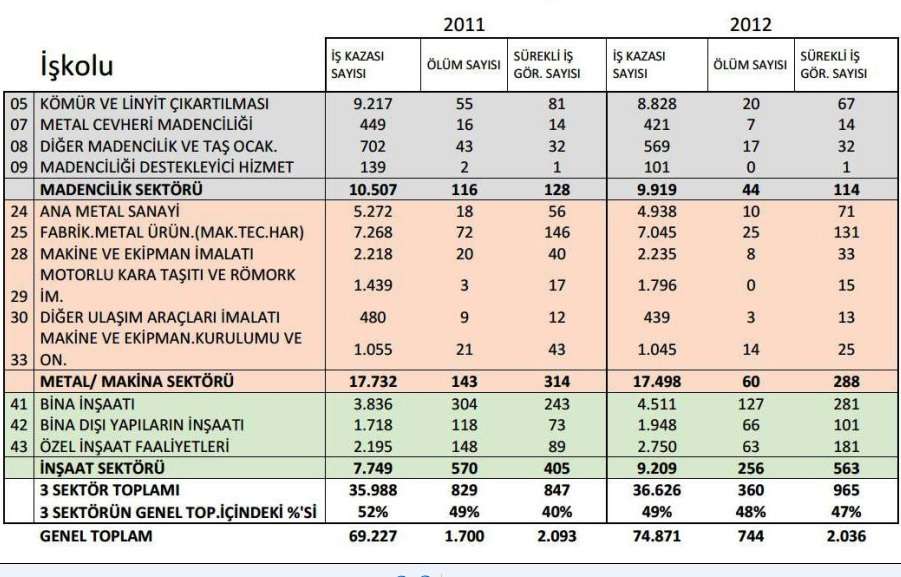 İnşaat, maden gibi sektörler iş kazalarının sayısal çokluğu ve ağır sonuçları bakımından Türkiye’deki iş kolları arasında ilk sırada yer almaktadır. İnşaat işverenlerinin ve uygulamada görev yapan teknik elemanların bu sorunun bilincinde olması, iş güvenliğini sağlamaya yönelik mevzuat maddelerini özenle uygulaması esastır.