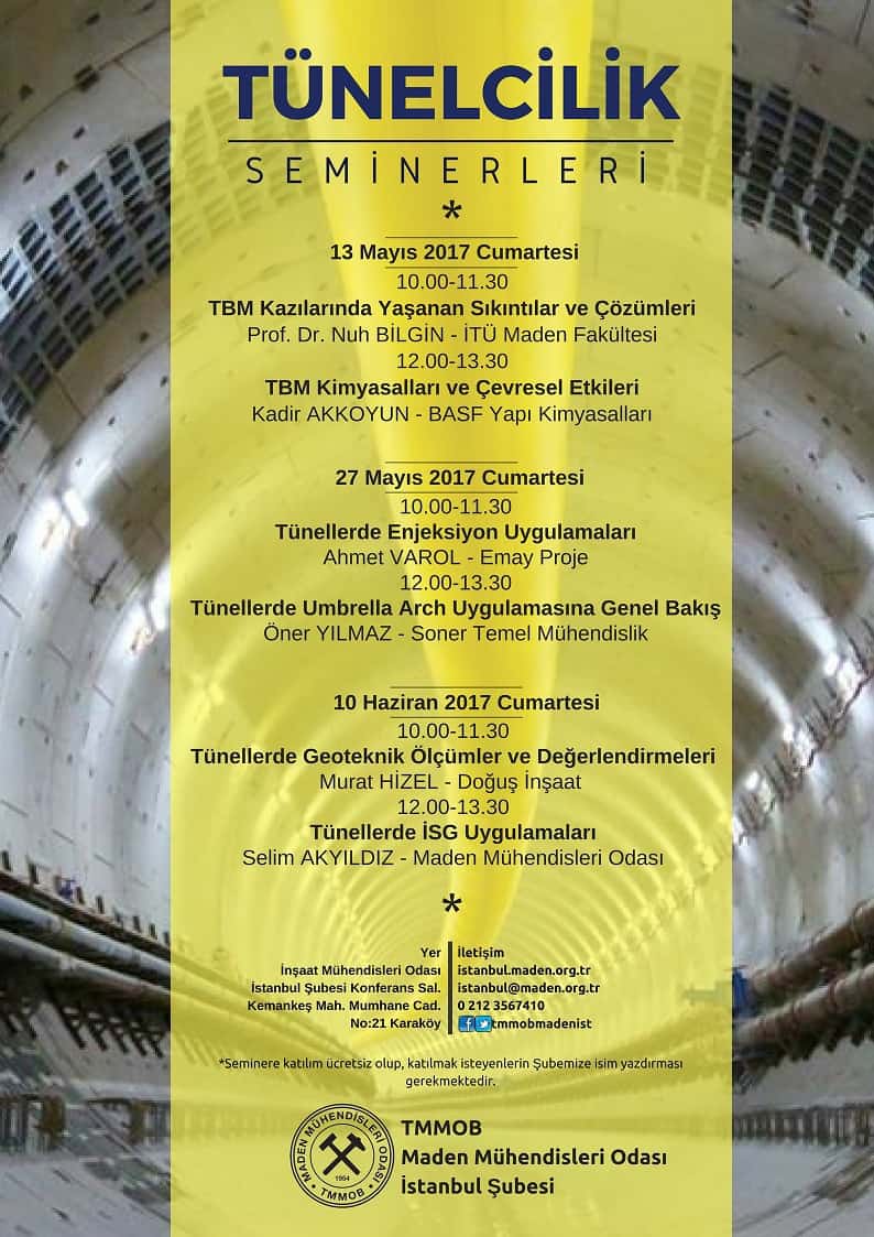 TMMOB Maden Mühendisleri Odası İstanbul Şubesi, Tünelcilik sektörüne ve bu sektörde çalışan mühendislere yönelik planlanan Tünelcilik Seminerlerine Mayıs ayı itibari ile başlıyor.