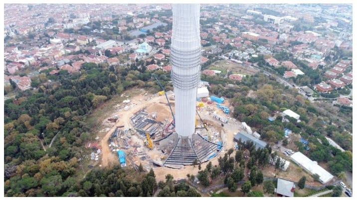 Çamlıca Kulesinin yapımında artık sona yaklaşıldı. Kulenin dış cephesindeki son parçaların da monte edildiği görülürken, sosyal alanları barındıran blokların yerleştirilmesi devam ediyor. Kulenin yapımında gelinen son durum ise havadan görüntülendi.