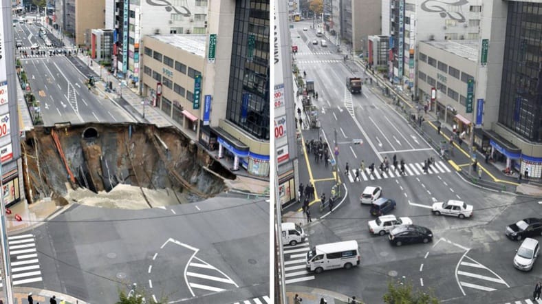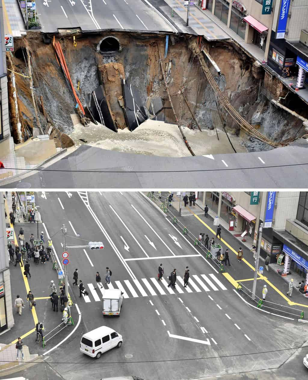 JR Hakata metro istasyonu yakınlarında 8 Kasım sabah saat 05:00 civarında meydana gelen ve su sızıntısından kaynaklandığı düşünülen olayda, otoyolun ortasında bir anda açılan 7-8 metrelik delikler toplu hâlde çökerek 30 metre genişliğinde, 15 metre derinliğinde bir çukur oluşturmuştu.